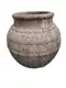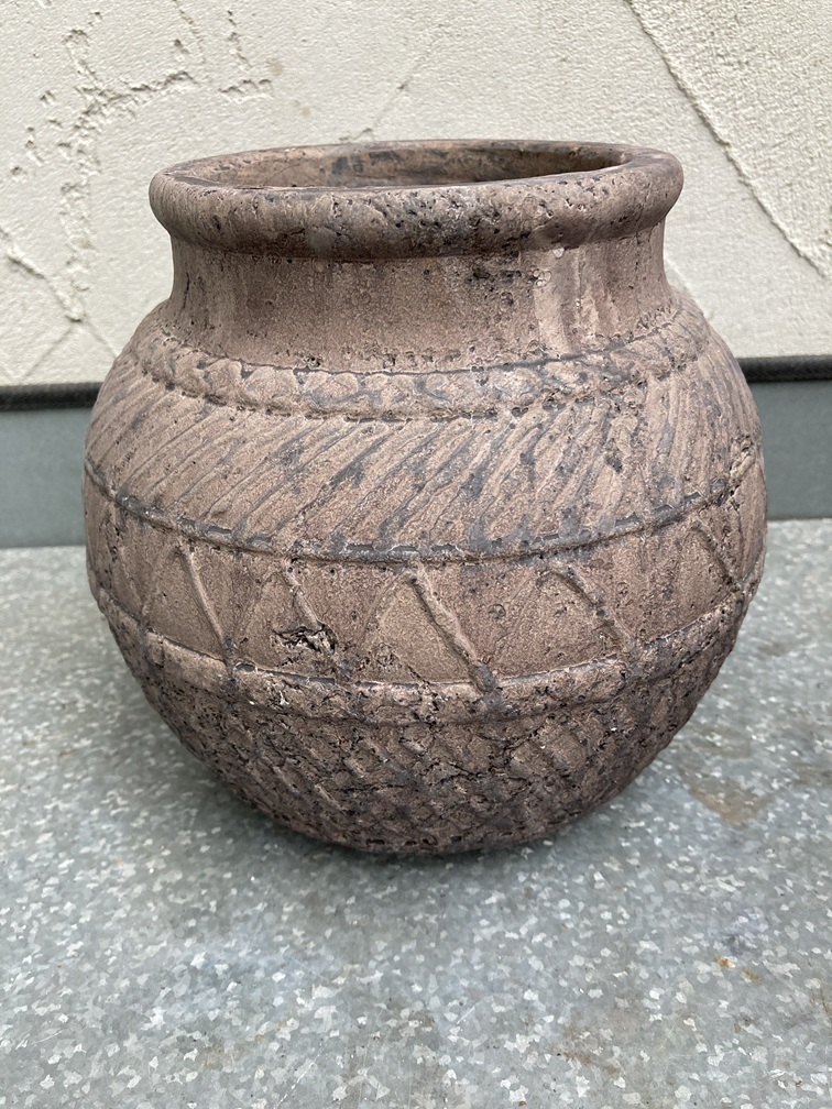 Zeer decoratieve pot met veel verschillende structuren, in oud look bruin.