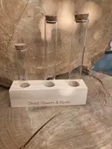 Decoratieve houten standaard met glazen reageerbuizen en kurk.