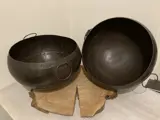 Oud donkerbruine grote schaal met heel veel spijkers en 2 handvaten.
