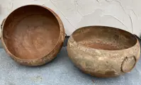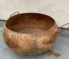 Oud roestbruine grote schaal met heel veel spijkers en 2 handvaten.