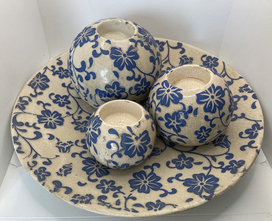Mooie grote schaal voorzien van 3 bol kandelaars geschikt voor waxinelichtjes.