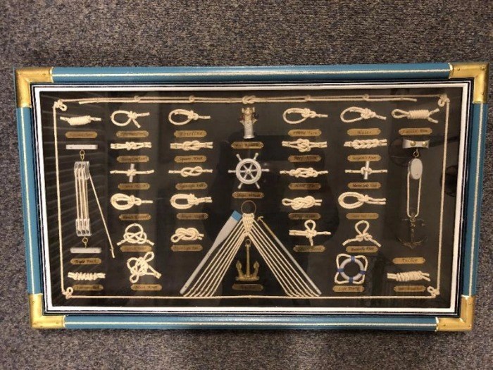 Men ziet o.a. alle knoop soorten met benamingen maar ook een aknker, een redding boei, een scheepsstuur wiel, etc.