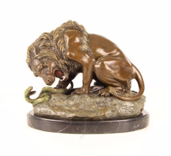 Levering: 1 x bronzen beeld + kleur leeuw en slang op marmer voet.