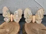 Vlinder is gemaakt van grof linnen met details, in geblokt en bloem decor stof, fijne rafia en kraal oogjes ook aan uiteinde voel sprieten.