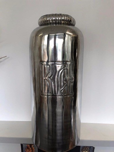 Vaas aluminium, zilver-look, met inscriptie, medium formaat, zeer fraai.