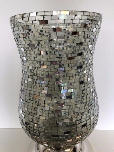 Vaas-windlicht, chimney moz chrystal, met spiegelend disco effect op nikkelen voet.
