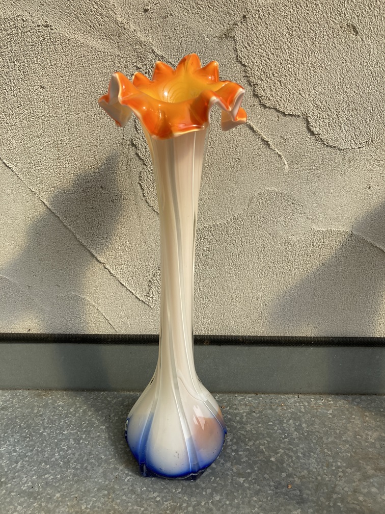 De binnen binnenzijde is oranje dat doorschijnt door het witte glas met een oranje mond en blauwe en iets oranje in de voet.