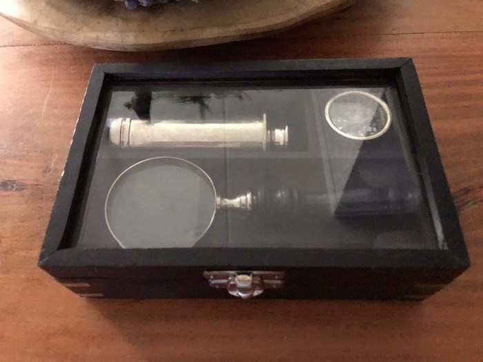 Levering: 1 x kado set, 1 x kompas, 1 x verrekijker, 1 x vergrootglas, 1 x opbergkist zwart hout-glas.