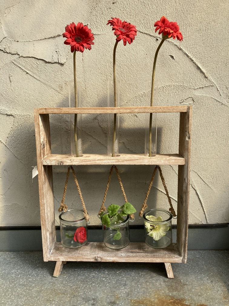WOODEN FRAME MET REAGEERBUISJES EN HANG POTJES