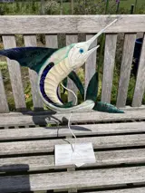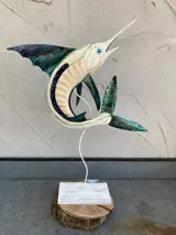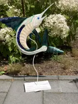 Metalen zwaardvis op voet is handgemaakt.