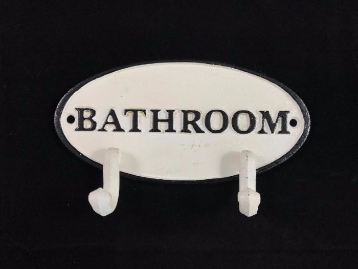 Een kapstok met 2 haken, bord met opschrift: ''BATHROOM'' als achtergrond, gietijzer.