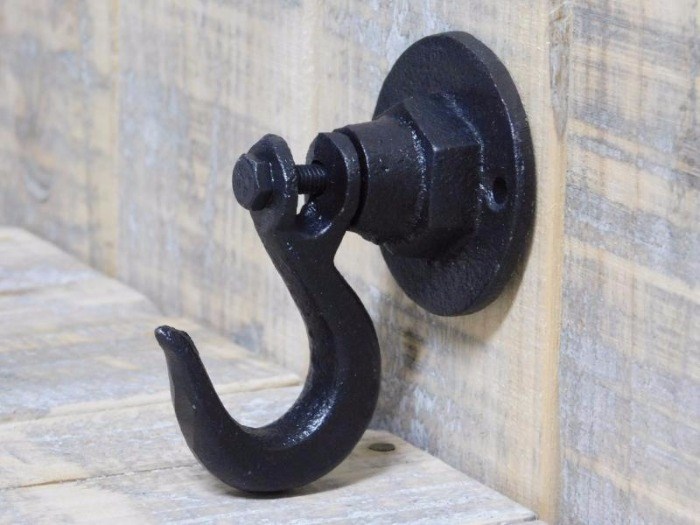 denk bijvoorbeeld aan bloemen of planten. Deze haak is gemaakt van gietijzer en is bruin van kleur.