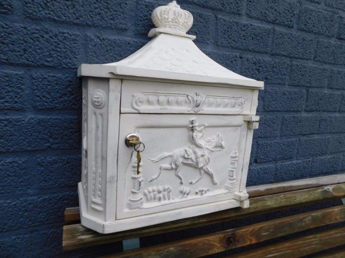 Antieke brievenbus , mailbox vervaardigd uit gegoten aluminium, creamy.