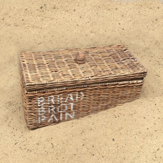 Broodmand van riet, rechthoekig model met rieten deksel en opdruk Bread, Brot en Pain.