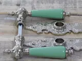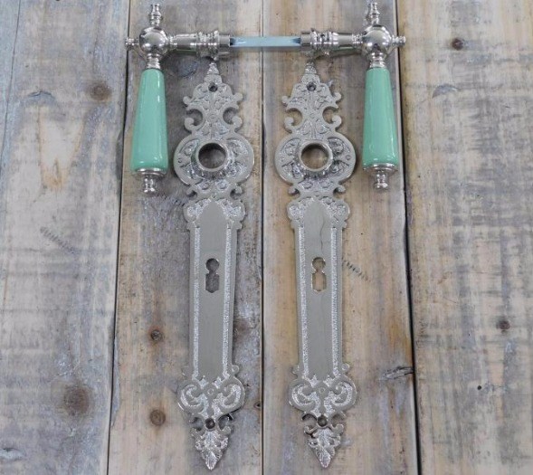 Een prachtige exclusieve set deurbeslag ''Tilspet'' met lange plaat van nikkel en een stijlvol handvat van pastelgroen porselein.