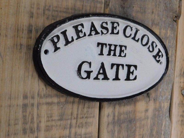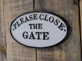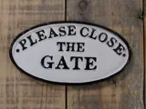 Een bordje met de tekst glose the gate'' voor aan de deur of poort.