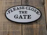 Bordje emaille ,close the gate , voor de deur , poort.