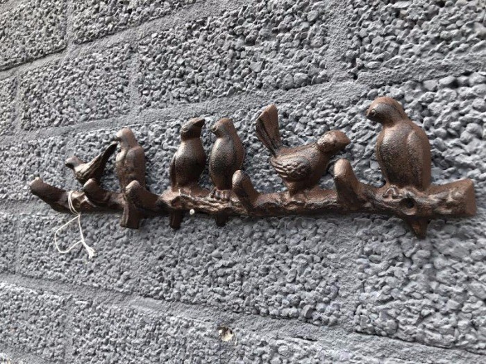 Prachtige tak met vogels, gietijzer met 5 kapstok haken.