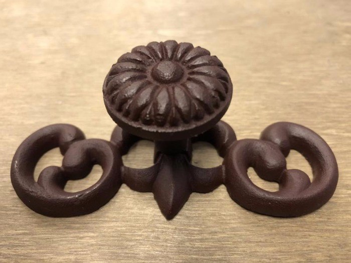 Smeedijzeren deurknop, kastknop, meubelbeslag, met rozet,bruin, fraai!