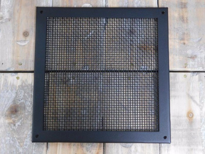 Groot vierkant luchtrooster met massief ,fijn gaas, mat zwart.