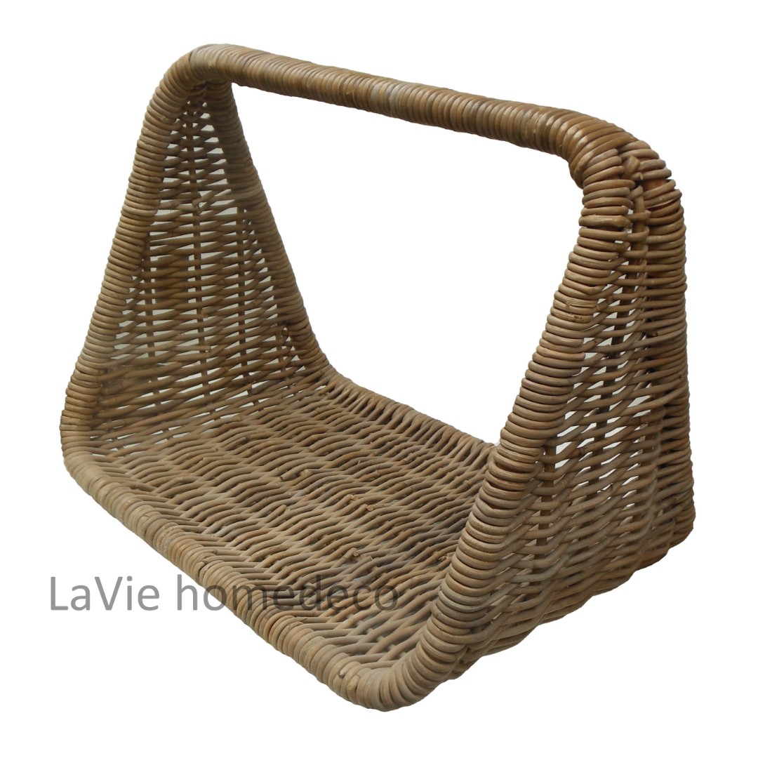 Deze houtmand is gemaakt van dik Koboo Grey riet gevlochten op een stevig bamboe frame.