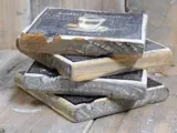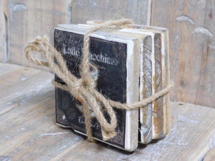 Een zet van vier leuke en handige onderzetters, Old Dutch, in touw gebonden.