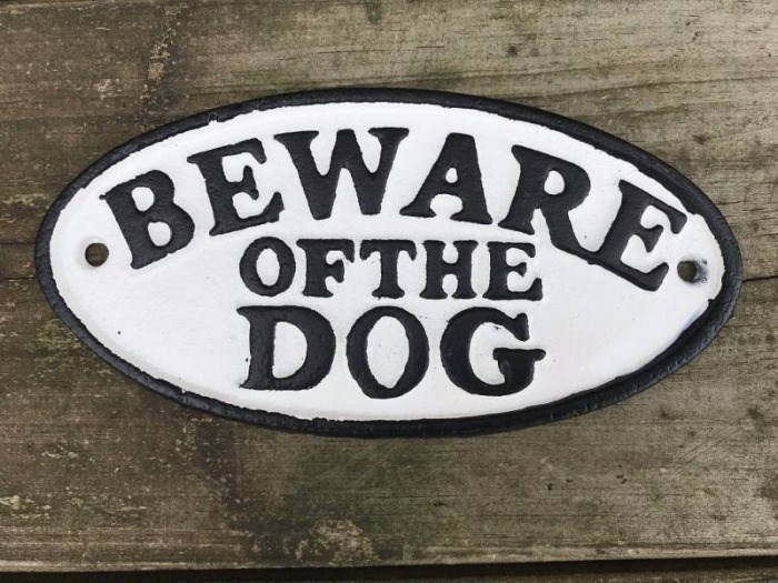 Een gietijzeren bordje met hierop de tekst: ''BEWARE OF THE DOG'', mooie vette letters!