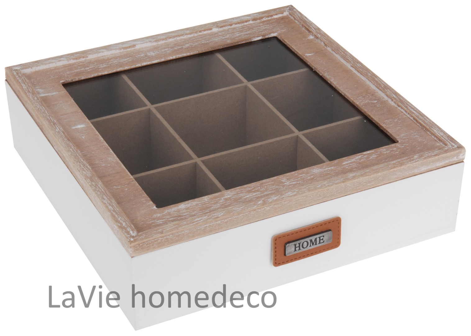 De theedoos is van hout, heeft een strak design en 9 vakjes voor verschillende smaken.