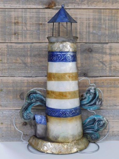 Mooi decoratie stuk is deze metalen vuurtoren, fraai om te zien door ook de prachtige kleuring.