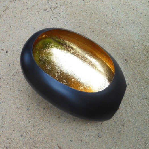 Dit windlicht in de vorm van een ei is goudkleurig van binnen en zwart van buiten.
