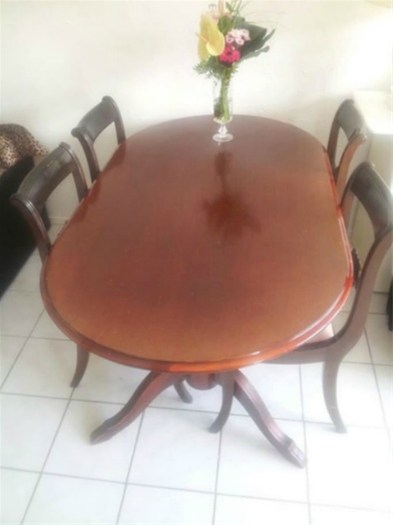 hierbij doe ik na een renovatie mijn eet hoek weg het is gemaakt van kersen hout en in de rug leuning van de stoel zijn prachtige mooie rozen er in gemaakt ,de zittingen van de stoel kun je er zo uit nemen om ze opnieuw te bekleden in modern of barok , ik zelf ben op zoek naar een wtte eet tafel met stoelen dus een open optie om te ruilen daar sta ik ook open voor .