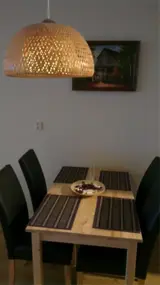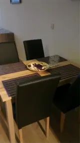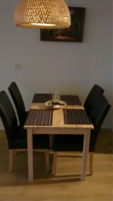 Gezellige houten eettafel met vier comfortabele stoelen