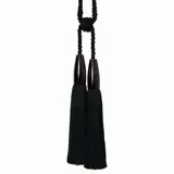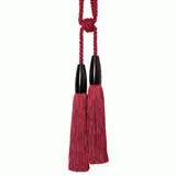 Een strakke sierlijke embrasse met ranke sierkwasten en bovenop mooie metalen kappen.