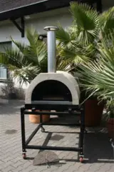 Hij wordt geleverd compleet met stalen frame op wielen op wielen zodat u de oven makkelijk kan verplaatsen op uw terras , de ruimte onder in het frame kunt u gebruiken als opbergruimte voor uw hout.
