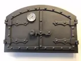 ovens zelf bouwen: gietijzeren pizzaoven- deur met temp. meter voor in de steenoven.