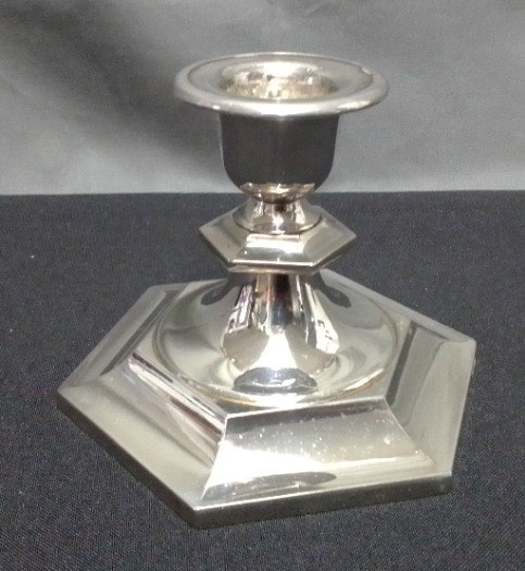 De kandelaar staat op een 6 hoekige voet in honingraat of hexagonmodel.