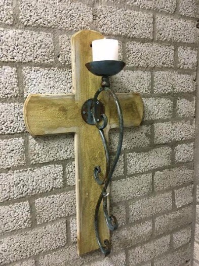 Levering: 1 x houten kruis met metalen kaarsenhouder.