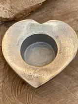 Zilverkleurige metalen waxinelichthouder in de vorm van een hart.