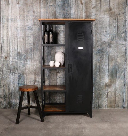De lockerkast is gemaakt van ijzer met mango houten planken.