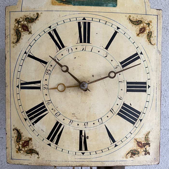 Prachtige 19e eeuwse Appelklok met slinger en afbeeldingen van een stadsgezicht en florale ornamenten.