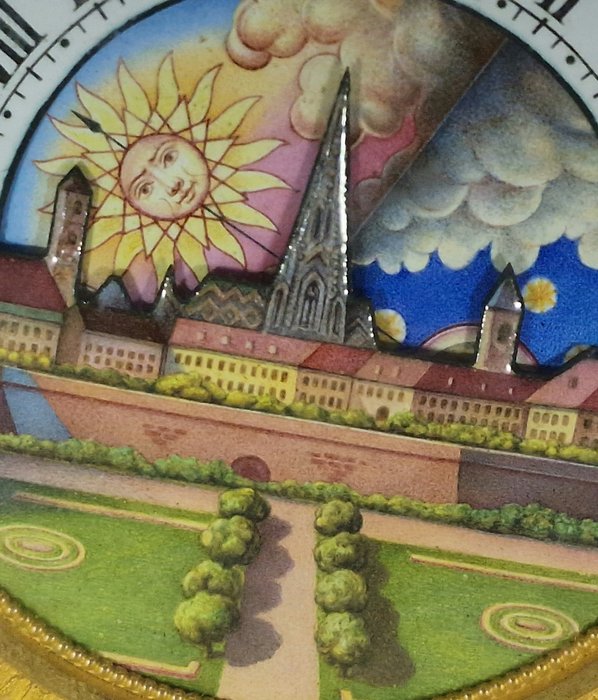 Fraaie, puntgave wijzerplaat in een uniek design. Hierboven ziet u een 12-uursschaal met Romeinse cijfers. Hieronder is een draaiende schijf die dag en nacht weergeeft - het mooiste schilderij en ontwerp. Hierboven is een stad binnen muren en een laan op de voorgrond. Schilderij van meesterhand - gedeeltelijk geëmailleerd.