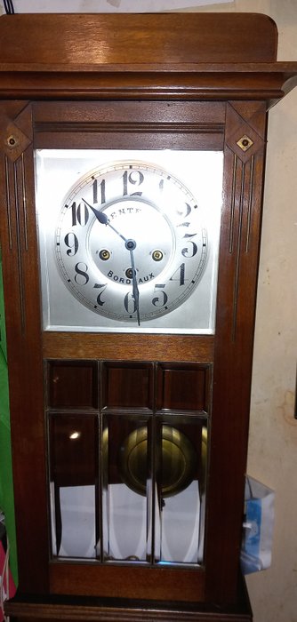 Westminster 8 stangen 8 hamers, volledig gereviseerd, ontvet, veren opnieuw gespannen, opnieuw geolied, opnieuw gekalibreerd, rinkelen 1/4, 1/2, 3/4 en uren uitschakelbaar rinkelen door middel van draden. Massief houten kist: Franse eik gesneden met mooie fijn gebeitelde patronen. Vierkante ramen bovenaan, rechthoekig afgeschuind onderaan in glas-in-loodstijl gedemonteerd om breuk te voorkomen opnieuw gemonteerd op aanvraag. Doos behandeld "inactieve houtwormen" Zeer mooi stuk! Gemerkt "BENTEJAC" BORDEAUX.