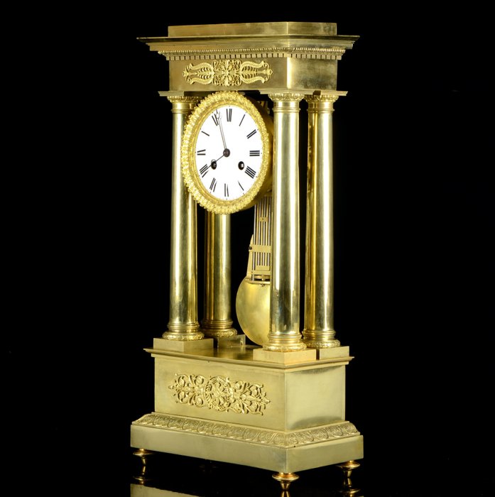 Van architectonische vorm, beweging ondersteund door vier Korinthische zuilen en op een getrapte sokkel gegoten, ondersteund door vier poten. Wit geëmailleerde wijzerplaat met Romeinse cijfers en Breguet wijzers, 8 daags uurwerk slagwerk op een bel en met buiten telwiel.