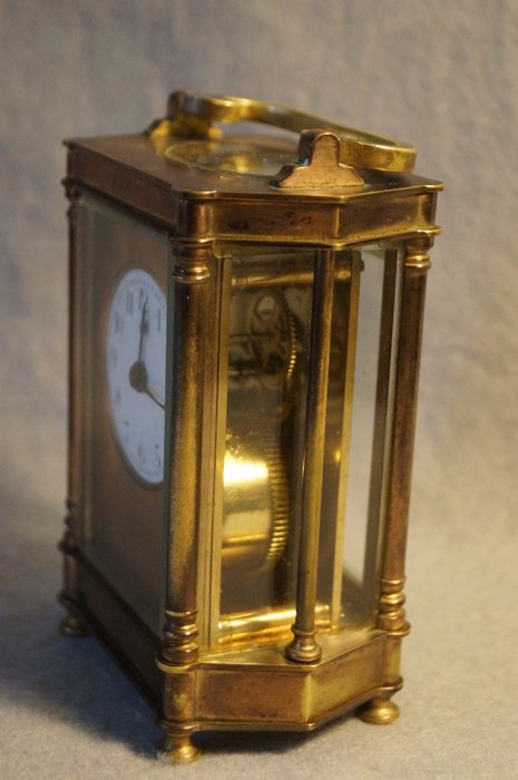 Reisklok in kast met afgeschuinde glazen panelen. De klok is van messing met een slingerend koetshandvat naar boven toe. Het heeft een messing voorplaat en een witte keramische wijzerplaat met Arabische cijferuurmarkeringen en zwarte blauwachtige stalen wijzers. De klok heeft een 8 daags mechanisch uurwerk. Er zijn afgeschuinde glazen panelen aan de zijkanten, met een klein afgeschuind ovaal glazen paneel aan de bovenkant van de klok. Aan de achterkant is een scharnierende deur die toegang geeft tot het uurwerk, het uurwerk is gemarkeerd met "Made in France" en ingesneden, maar geen duidelijke beschrijving op de basis.