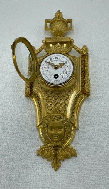 Zeer mooie kleine bronzen Franse Louis XVI mini Cartel wand klok. Prachtig, zeer gedetailleerd bronzen behuizing. In prima werkende staat voorzien van bol glazen venster. De klok is in prima lopende staat.