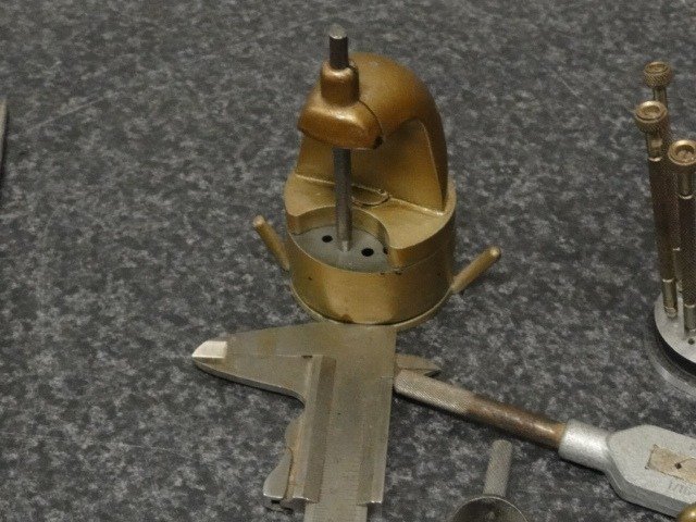 Beitels voor een draaibankje ,veilen , hamers , tangen , schroevendraaiers , schuifmaat , spiraalveertjes, sleuteltjes , pincetten , vergrootglazenenz enz ,