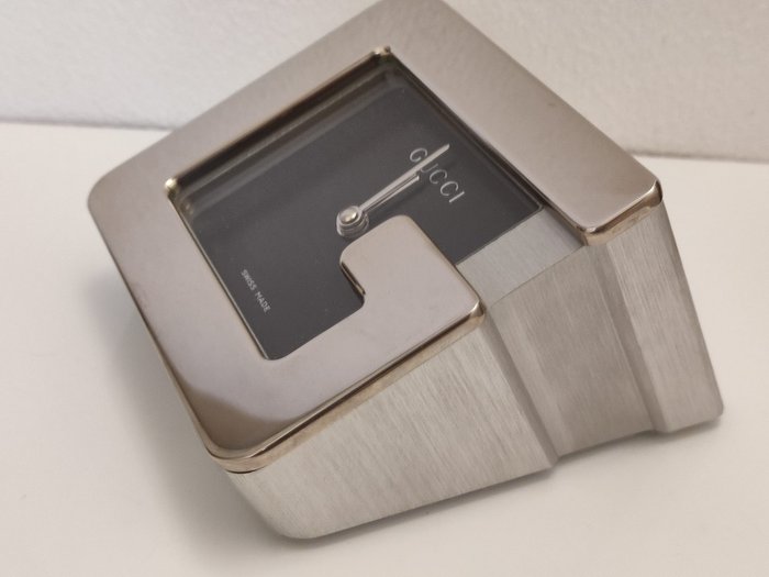 Stopgezet horloge, onbereikbaar, vooral nieuw zoals degene die ik u aanbied. Transistorbeweging op batterijen. Behuizing van geborsteld aluminium en Gucci "G" ring in verchroomd messing. Klok in perfect werkende staat met alarm/wekfunctie. Een ongelooflijk en luxueus meubelstuk dat uw omgeving zal verfraaien. Afmetingen: 7 cm hoog, 10 cm breed en 12 cm diep; het gewicht is ongeveer 700 gram.