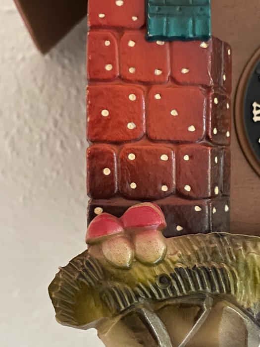 Een leuke koekoeksklok van Hans en Grietje. Welk goed functioneert.Bij elk half uur komt de Heks uit haar huisje en hoor je de gongslag met koekoeksroep. Heb er zelf geen 2e van gezien is zeldzaam.De maat is 22x21x12 cm.Wordt goed verpakt en aangetekend verstuurd.