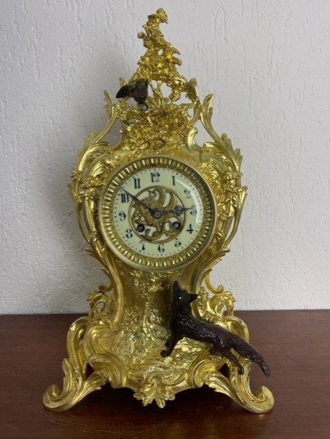 Zeer fraaie, bronzen Rococo pendule. De klok is zeer gedetailleerd uitgevoerd en in prima lopende staat. De tijd wordt weergegeven door gestileerde wijzers en Arabische cijfers. De wijzerplaat wordt beschermd door een glazen venster gevat in een bronzen montuur. Het hart van de wijzerplaat is fraai gedecoreerd. Bovenin de klok ziet u een vogel met in zijn snavel een muntstuk. Op de voet van de klok ziet u een vos uitgebeeld. De klok wordt geleverd met sleutel en slinger van latere datum.
