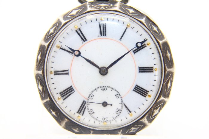 Schitterend zilveren horloge. Art Nouveau-periode eind 1800. Het horloge is in gekeurd zilver van 43 mm, totaal gewicht 56,2 gram. Wat het onderscheidt, is de prachtig gebeitelde kast en het centrale monogram dat de schittering verbetert. Wijzerplaat met Romeinse cijfers. , compleet mechaniek maar in werking te stellen. Uitzonderlijke schoonheid en originaliteit. Verzamelbaar en draagbaar.. Absoluut niet te missen.